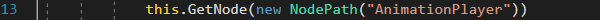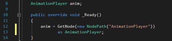 It also has a member called "anim" that stores a reference to an animation player in the scene. Since there is no "onready"-keyword in C# that reference is filled in the _Ready()-method.