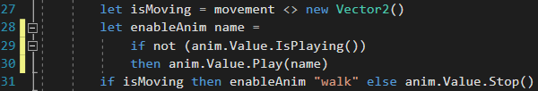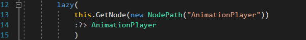 Lines 11-15 initialize the anim member. Again there is no onready keyword, but F# has the lazy-keyword which works quite similar in this case. By wrapping something in "lazy(...)" we can define that this value should not be determined until it is needed for the first time.