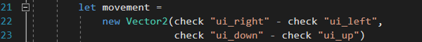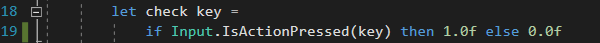 The first thing you'll notice that the if-else-pattern from the C# script appears only once in the F# version. Line 18 defines a function that turns the name of an input action into a 1 or a 0