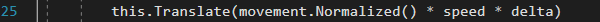 There isn't much to be said about line 25 other than that F# requires us to explicitly call Transform on "this.", and that some people would have started the line with the optional "do"-keyword (as in "do this.Translate(...)") to signal that this line is executed because of its side effect only and doesn't have a return value.