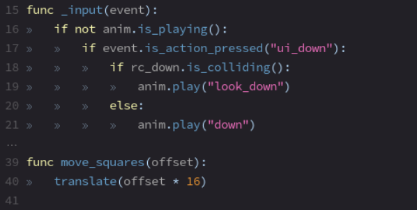 This can only be done in a call to a GDscript function, because animations can only set absolute values. The second animation track sets the local position of the player sprite to values ranging from (0,0) to (0,16), but in the end the player needs to be moved relative to its start position, which is what the translate()-method inside the move_squares()-method does.