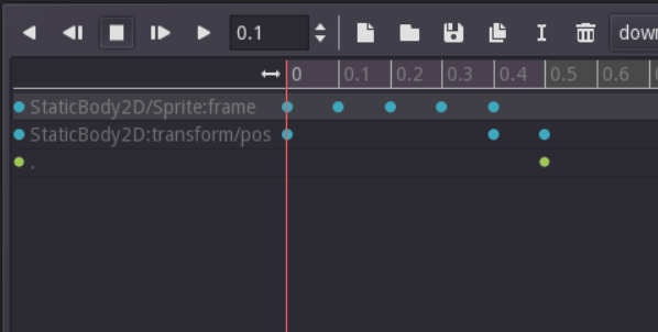The "down"-animation performs the actual movement over several frames by advancing the animation frame (track 1) and moving the player down across one square (track 2).