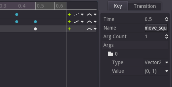 If you edit the key you'll find that it calls the move_squares()-method with a parameter of(0,1), so it moves the player down one square (that's why the second animation track needs to reset the offset of the player sprite in the last frame).