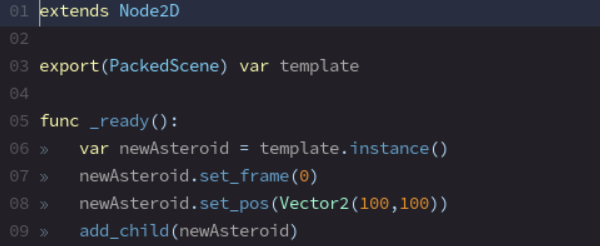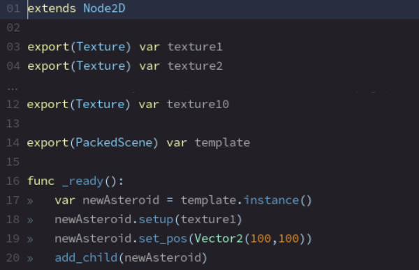 The first example contained in the folder "SetupCode" simply preloads all textures for the different asteroids and the asteroid scene that defines the common basis of all asteroids. Then when _ready() is called the asteroid scene is instantiated and a function called "setup()" is called on the new instance, which takes a texture as a parameter and applies it to the asteroid.