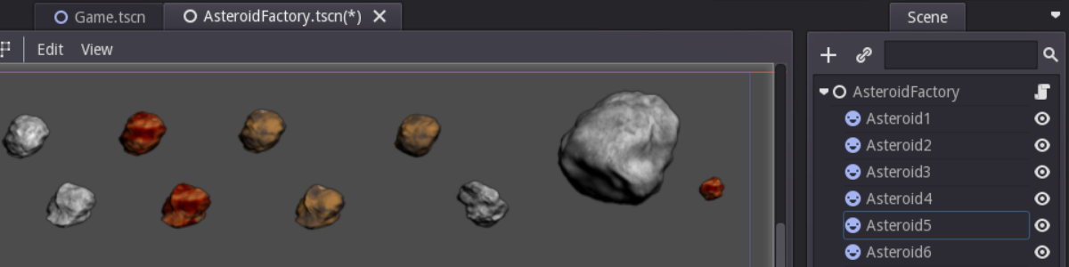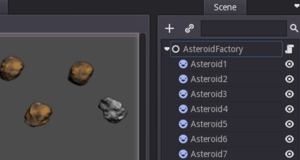 The script attached to this scene has a generate_asteroid()-function that takes an index as a parameter and returns a duplicate of the child node at that index in the factory scene.