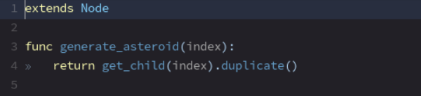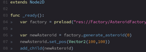 Creating an instance is now about as easy as in the previous example, since again you only need to provide a random index to select a type of asteroid. The main difference is that now the new asteroid object is not created by calling instance() on a packed scene but by calling generate_asteroid() on an instance of the factory scene.